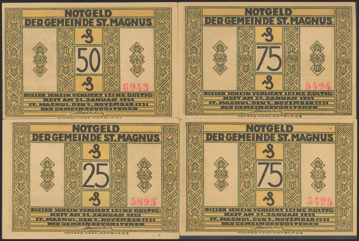 GERMANY. NOTGELD (SANKT MAGNUS). Set of 4 banknotes: 25 Pfennig, 50 Pfennig, 75 Pfennig (2) from 1922. (Grabowski / Mehl: 1166.1). Uncirculated.