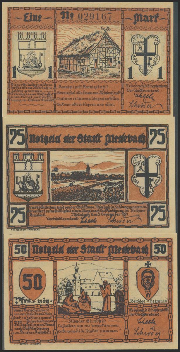 GERMANY. NOTGELD (MEDEBACH). Complete set of 3 banknotes: 50 Pfennig, 75 Pfennig, 1 Mark from 1921. (Grabowski / Mehl: 875.1-1 to 3). About Uncirculated.