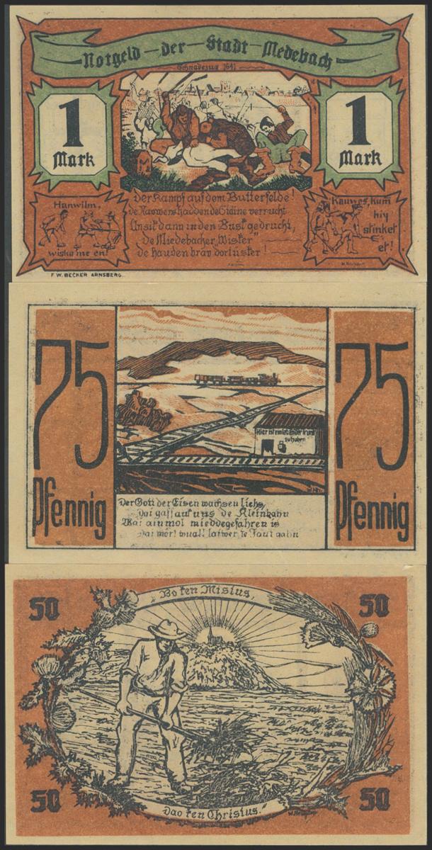 GERMANY. NOTGELD (MEDEBACH). Complete set of 3 banknotes: 50 Pfennig, 75 Pfennig, 1 Mark from 1921. (Grabowski / Mehl: 875.1-1 to 3). About Uncirculated.