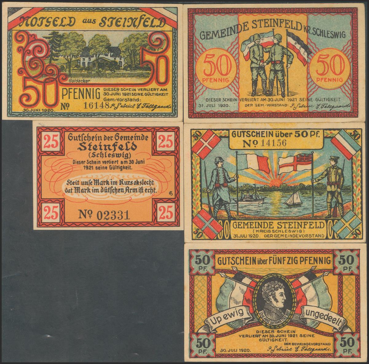 GERMANY. NOTGELD (STEINFELD). Set of 5 banknotes: 25 Pfennig, 50 Pfennig (4) from 1920. (Grabowski / Mehl: 1262.1a, 1262.2a, 1262.3a-1 to 2, 1262.4-4). About Uncirculated.