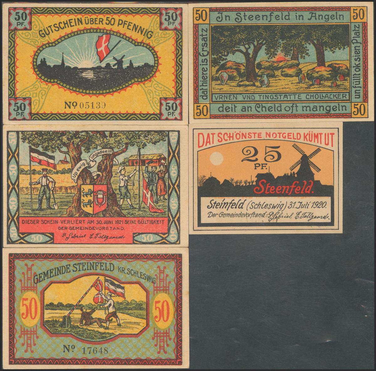 GERMANY. NOTGELD (STEINFELD). Set of 5 banknotes: 25 Pfennig, 50 Pfennig (4) from 1920. (Grabowski / Mehl: 1262.1a, 1262.2a, 1262.3a-1 to 2, 1262.4-4). About Uncirculated.