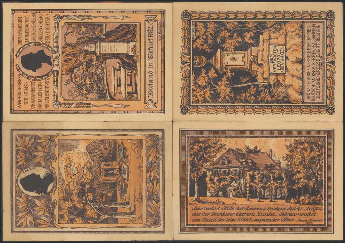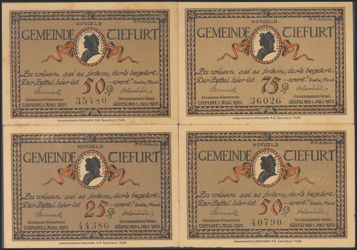 GERMANY. NOTGELD (TIEFURT): Complete set of 4 banknotes: 25 Pfennig, 50 Pfennig (2), 75 Pfennig from 1922. (Grabowski / Mehl: 1323.1a-1 to 4). About Uncirculated.