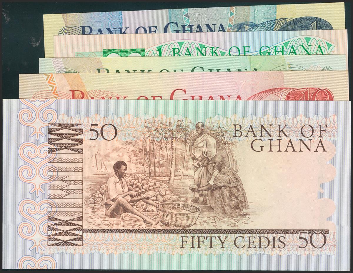 GHANA. Set of 5 banknotes: 1 Cedi (2), 2 Cedis, 10 Cedis, 50 Cedis. 1976-1982. (Pick: 13c, 14c, 16f, 17b, 22b). Uncirculated.