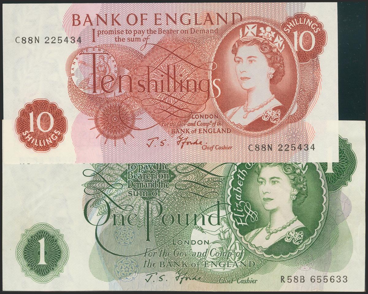 GREAT BRITAIN. Set of 2 banknotes: 10 Shillings, 1 Pound. 1966. (Pick: 373c, 374f). 10 Shillings is Uncirculated, 1 Pound is Very Fine.