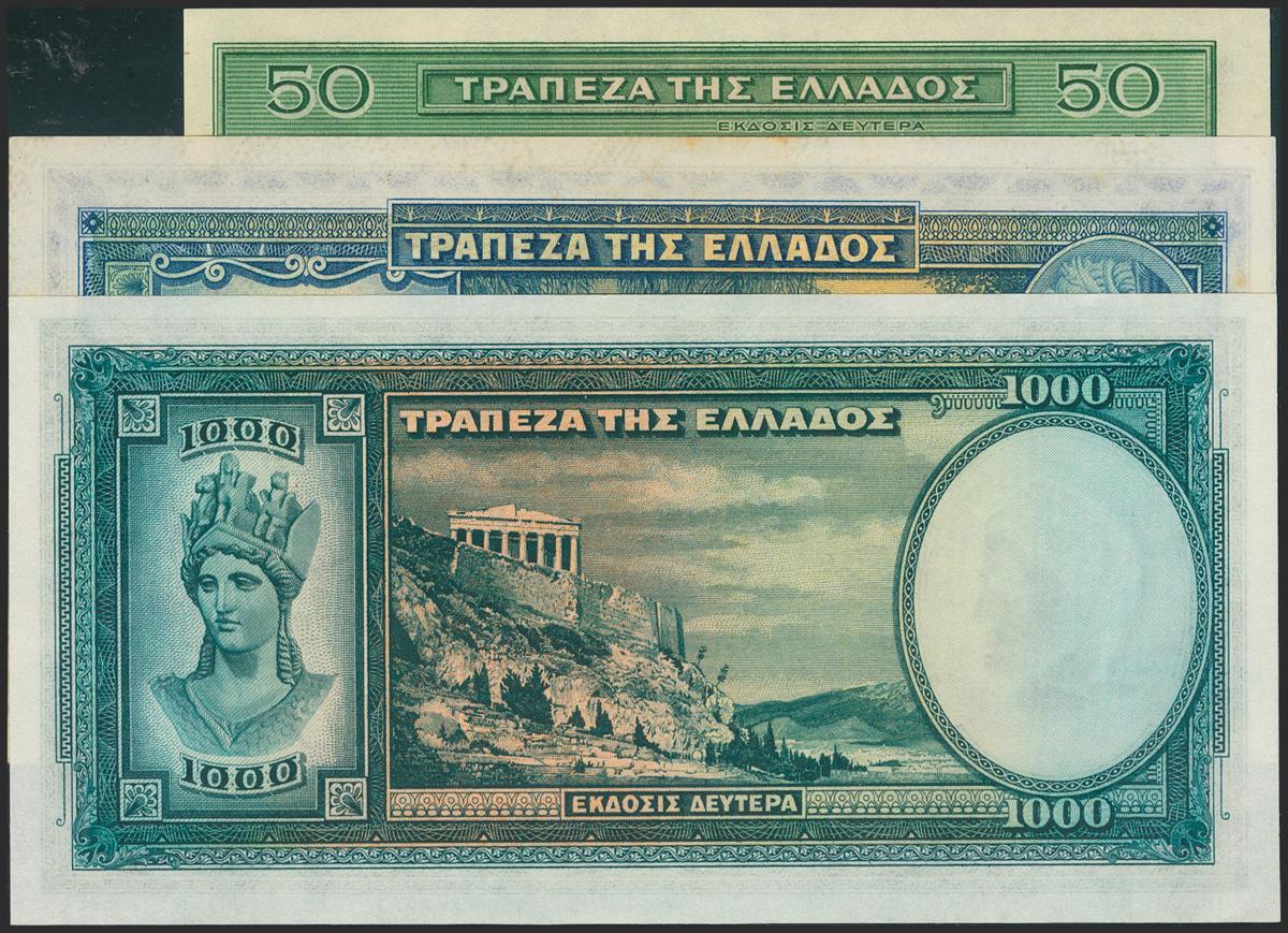 GREECE. Set of 3 banknotes: 50 Drachmai, 500 Drachmai, 1000 Drachmai. 1939. (Pick: 107a, 109a, 110a). Minor foxing spots on 109a. About Uncirculated to Uncirculated.