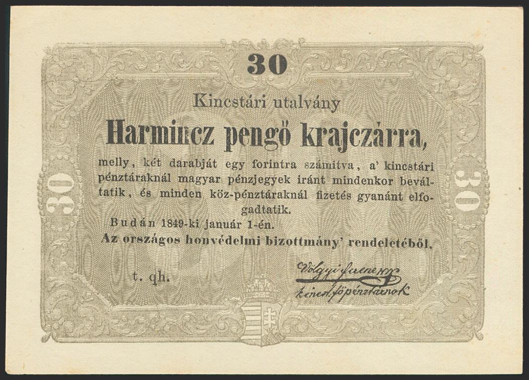 HUNGARY. 30 Pengö. 1849. National Army Deffense Committee. Month in date spelled correctly (január). (Pick: S122). Rare in this quality. About Uncirculated.