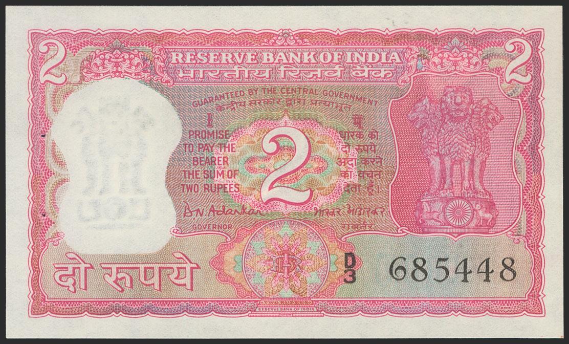 INDIA. 2 Rupees. 1969. (Pick: 67b). Usual staple holes. Uncirculated.