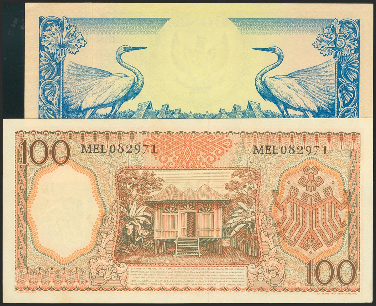 INDONESIA. Set of 2 banknotes: 25 Rupiah, 100 Rupiah. 1958-1959. (Pick: 59, 67a). Uncirculated.