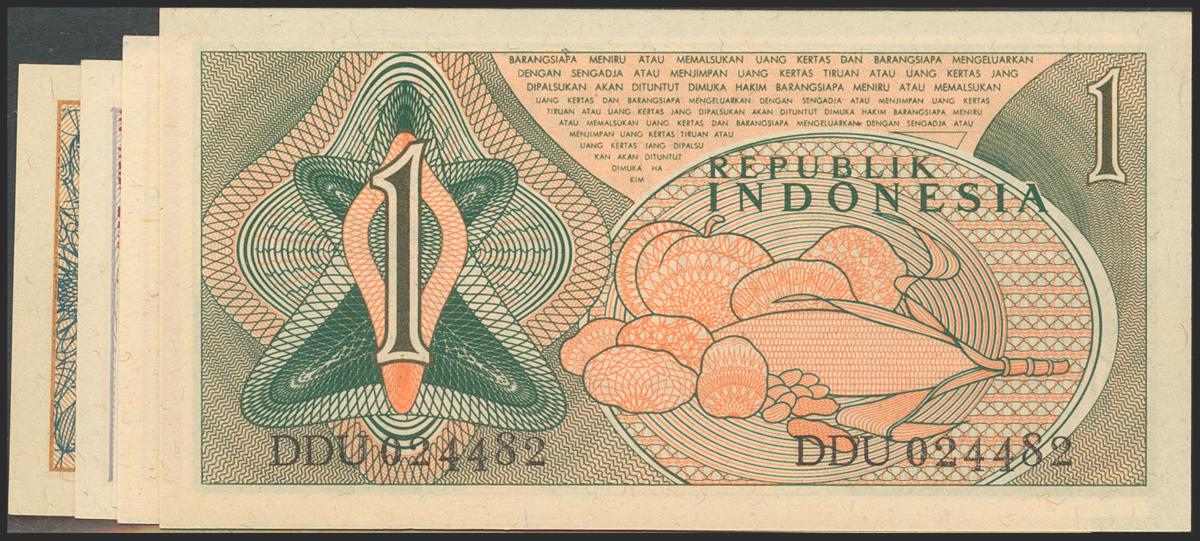 INDONESIA. Set of 4 banknotes: 1 Rupiah, 100 Rupiah (2) and 500 Rupiah. 1956-1996. (Pick: 74,122a, 127a, 128e). Pick 74 has rounded corners. Uncirculated.