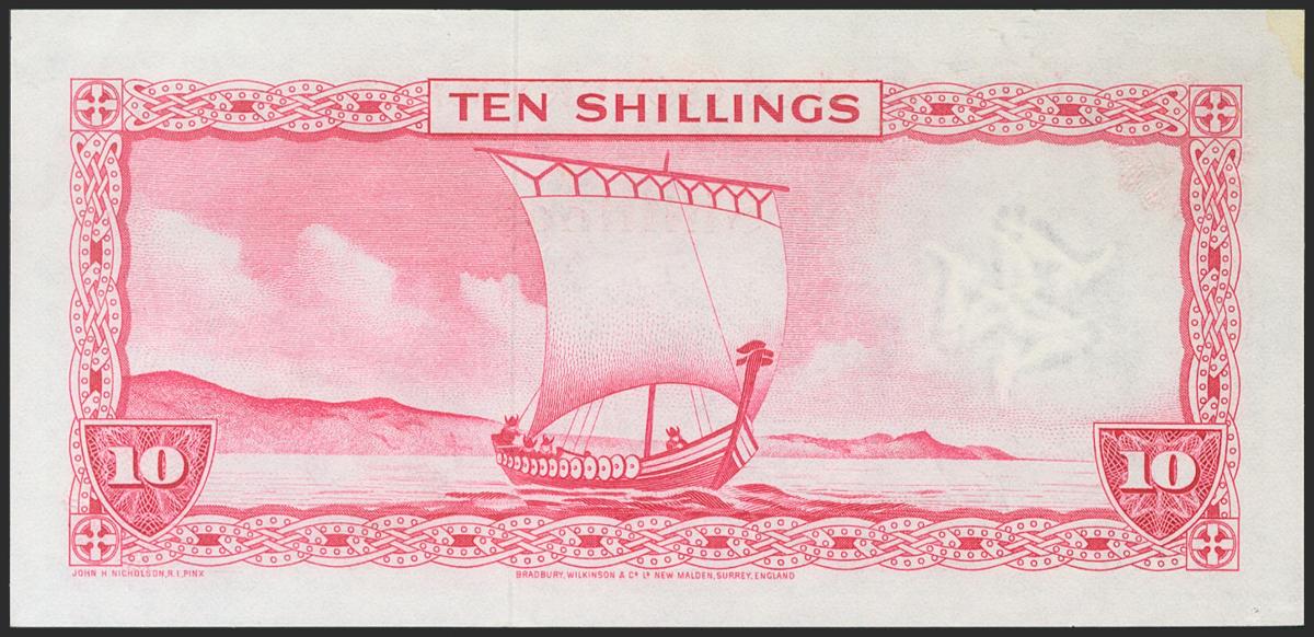 ISLE OF MAN. 10 Shillings. 1961. (Pick: 24a). Stain on upper left corner. About Uncirculated.