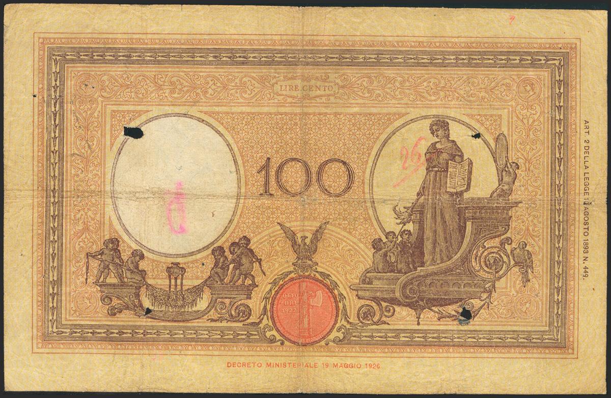 ITALY. 100 Lire. 1925. (Pick: 39f). Rare. Holes, writing. Good.