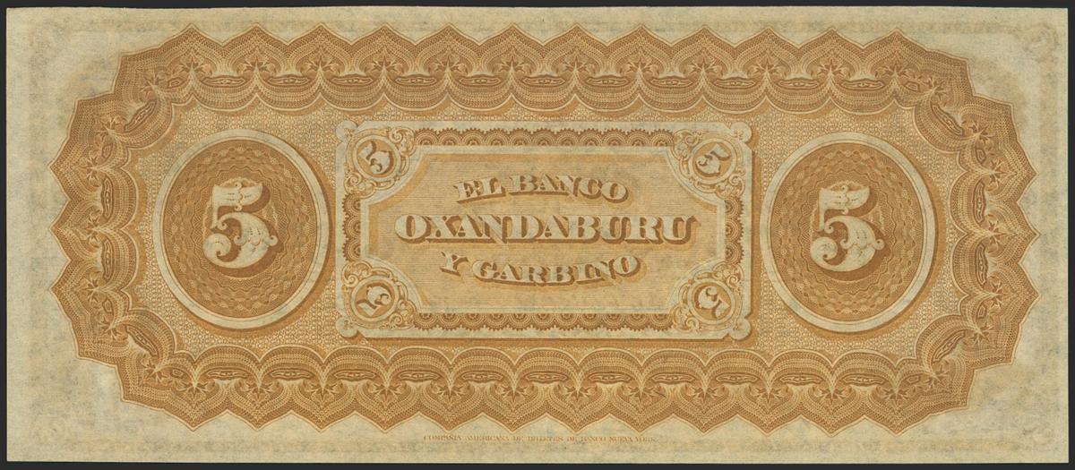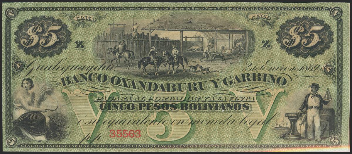 ARGENTINA. 5 Pesos Bolivianos. 1869. Banco Oxandaburu y Garbino. (Pick: S1783r). Extremely attractive, unsigned remainder note. Uncirculated.