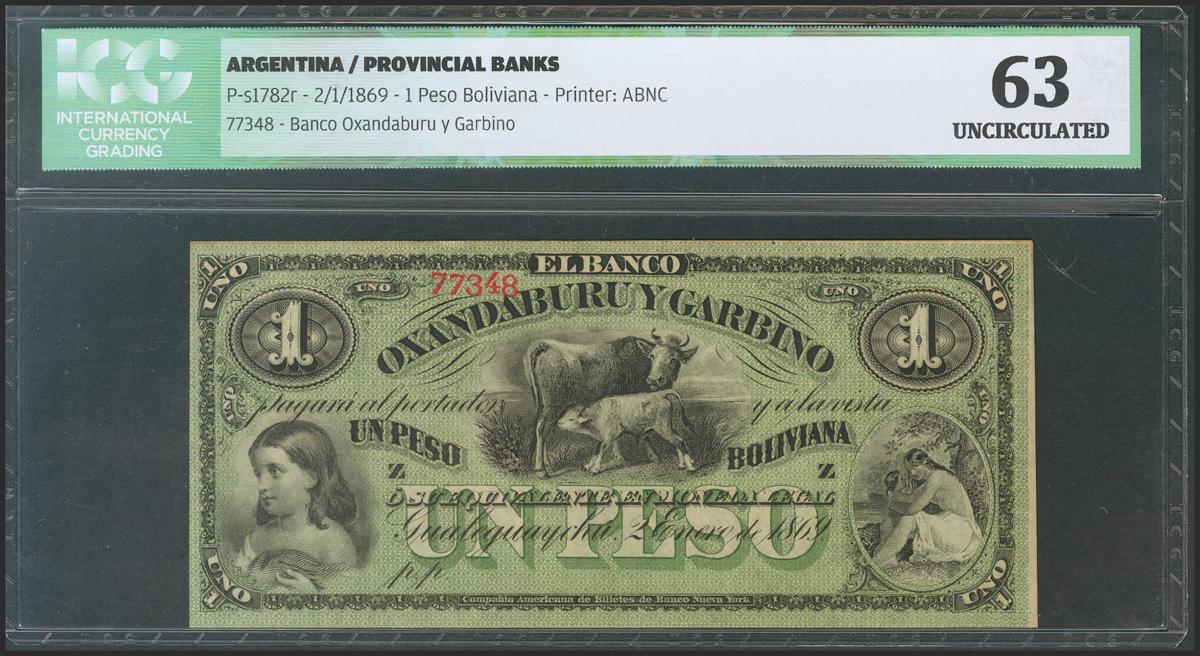 ARGENTINA. 1 Peso Boliviano. 2 January 1869. (Pick: s1783r). ICG63.