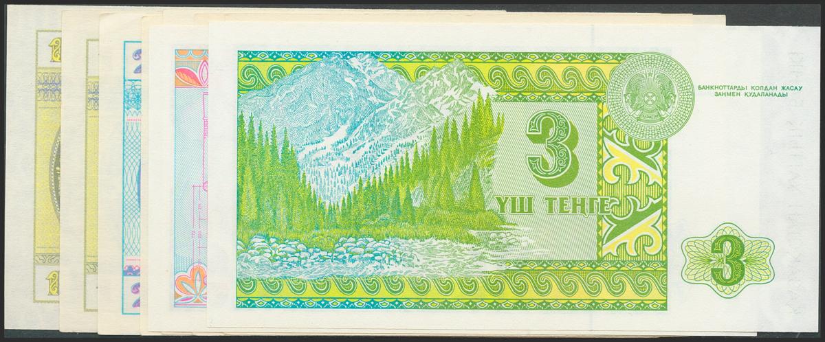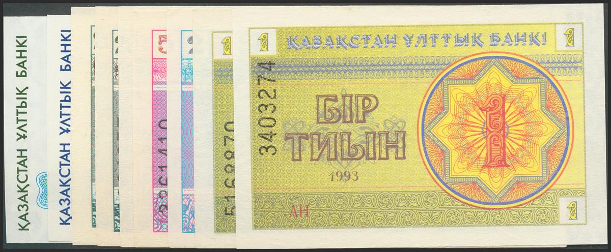 KAZAKHSTAN. Set of 9 banknotes: 1 Tyin (2), 2 Tyin, 5 Tyin, 10 Tyin, 20 Tyin (2), 1 Tenge and 3 Tenge. 1993. (Pick: 1c, 1d, 2b, 3a, 4a, 5a, 5b, 7a, 8a). Uncirculated.
