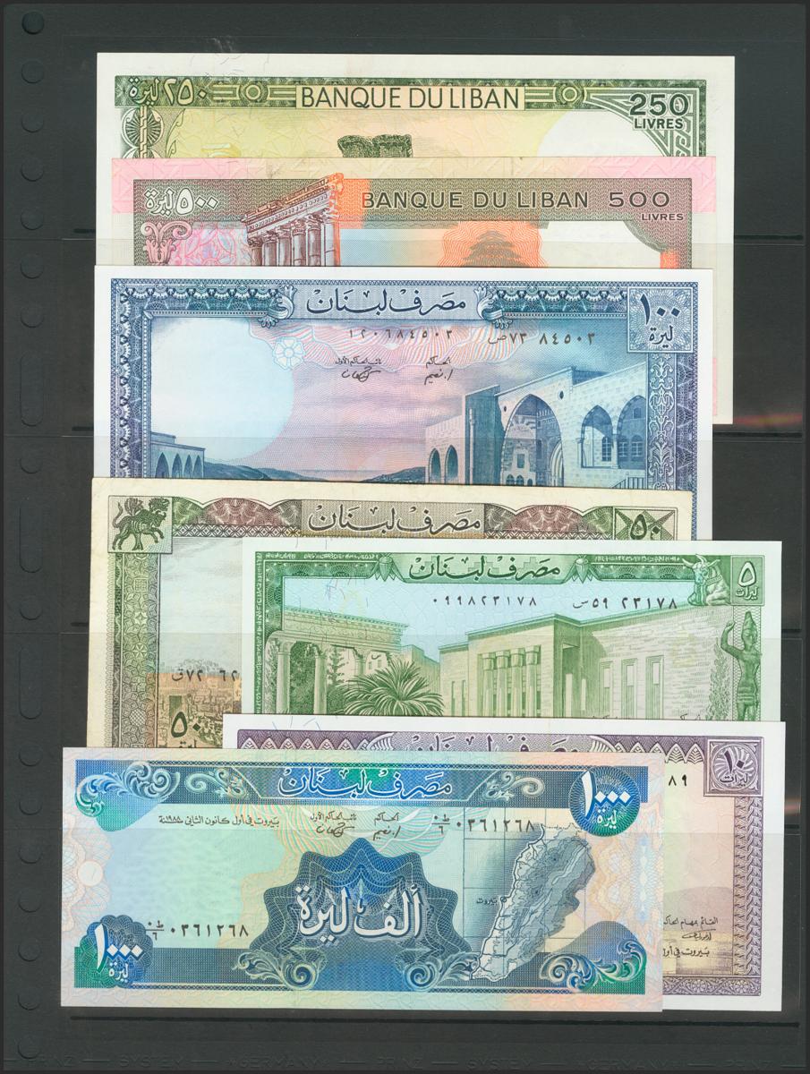 LEBANON. Set of 7 banknotes, different values and years. Uncirculated except 65 which is Very Fine.