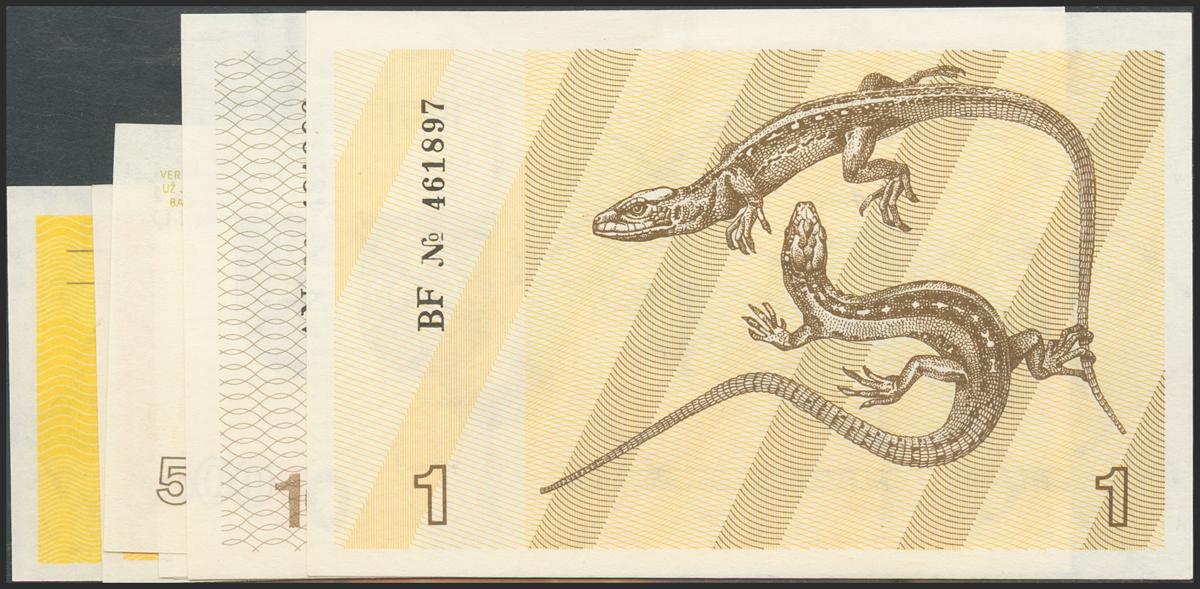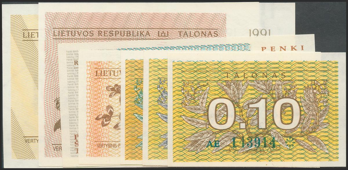 LITHUANIA. Set of 7 banknotes: 0.10 Talonas, 0.20 Talonas, 0.50 Talonas, 1 Talonas (2), 10 Talonas and 500 Talonas. 1991-1993. (Pick: 29a, 30, 31b, 32b, 35b, 39, 46). Uncirculated.