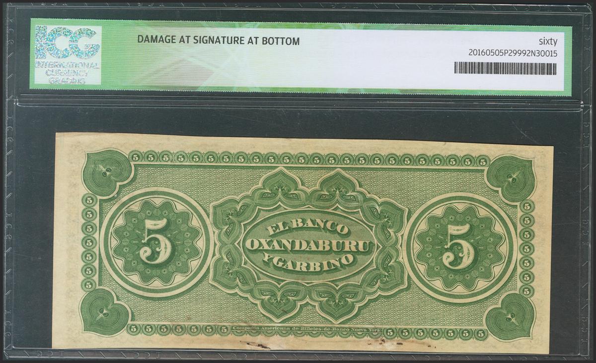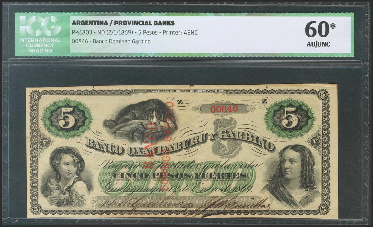 ARGENTINA. 5 Pesos. 2 January 1869. Low Numeration. (Pick: s1803). ICG60* (DAMAGE AT SIGNATURE AT BOTTOM).