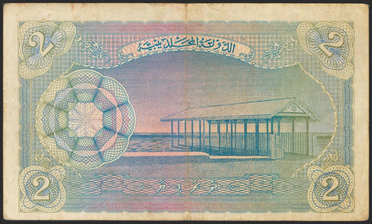 MALDIVES. 2 Rufiyaa. 1947. (Pick: 3). Rare. Dirty edges. Very Fine.