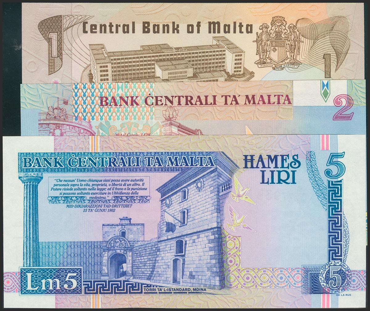 MALTA. Set of 3 banknotes: 1 Lira, 2 Liri, 5 Liri. 1979-1994. (Pick: 34b, 45d, 46d). Uncirculated.