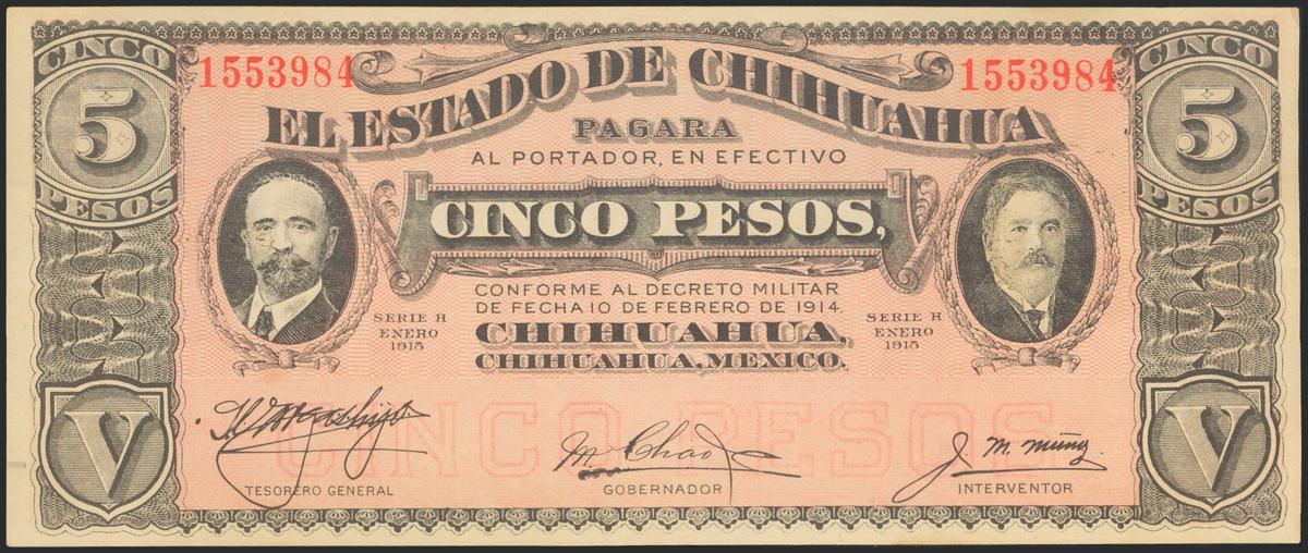 MEXICO. 5 Pesos. 1915. Estado de Chihuahua. (Pick: S532a). About Uncirculated.
