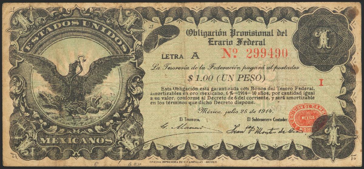 MEXICO. 1 Peso. 1914. Obligación Provisional del Erario Federal. (Pick: Not Listed). Scarce. About Very Fine.