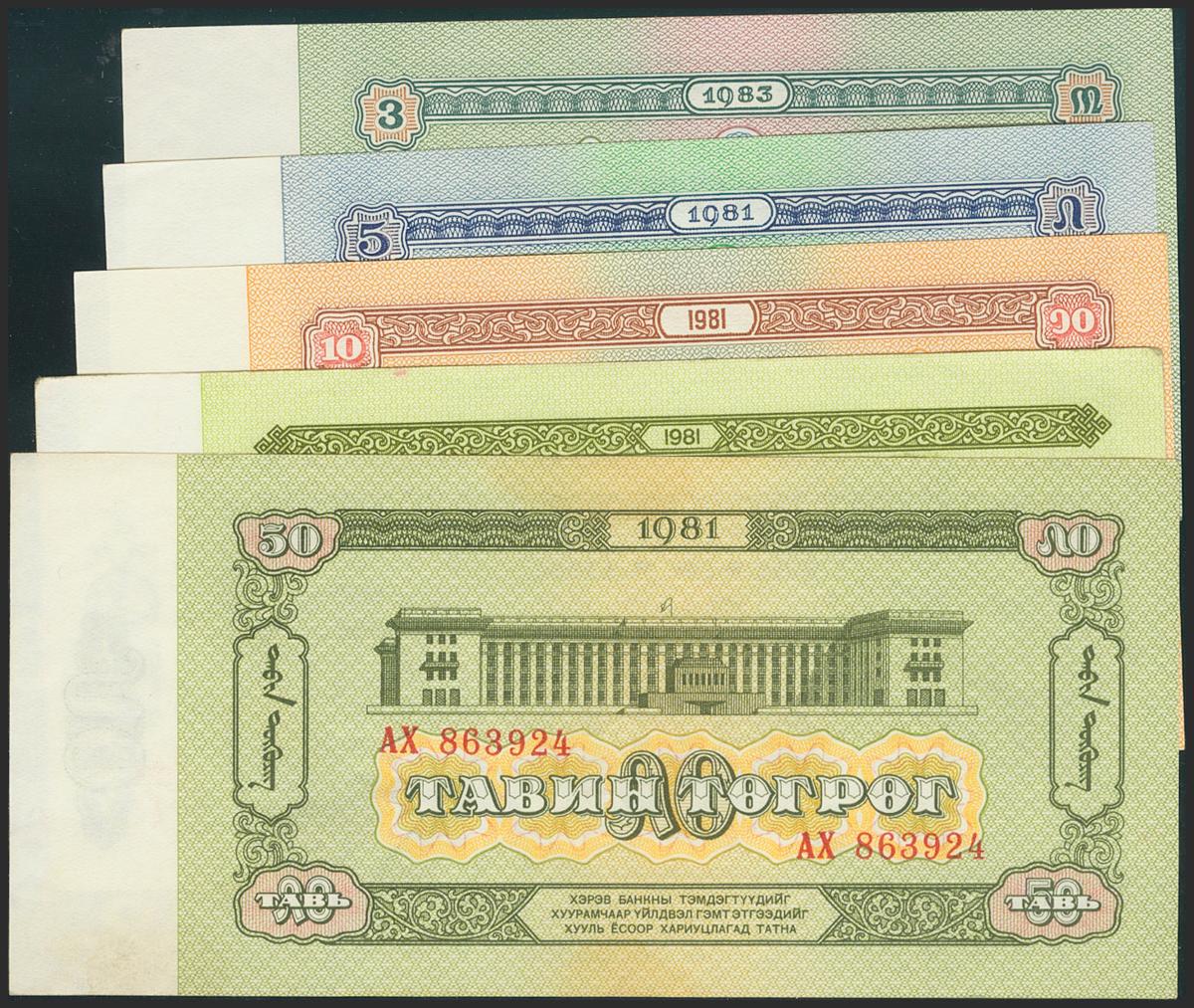 MONGOLIA. Set of 5 banknotes: 3 Tögrög, 5 Tögrög, 10 Tögrög, 20 Tögrög, 50 Tögrög. 1981-1983. (Pick: 43, 44, 45, 46, 47). 47 is a bit dirty on bottom right corner. About Uncirculated to Uncirculated.