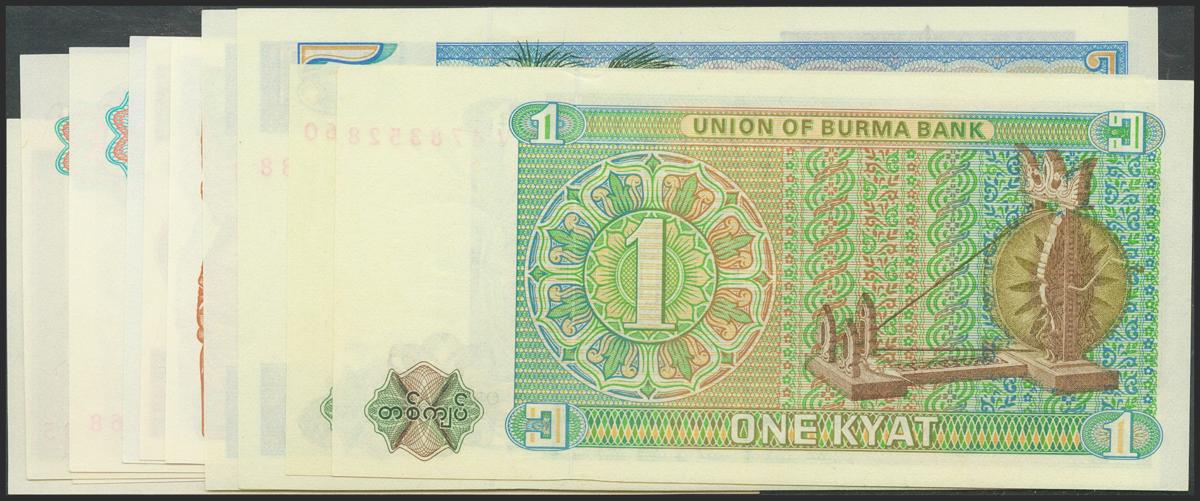 MYANMAR/BURMA: Set of 12 banknotes: 50 Pyas (2), 1 Kyat (5), 5 Kyat (4) and 10 Kyat. 1972-1990. (Pick: 56, 57, 67, 68, 69, 70b, 71b). Uncirculated.
