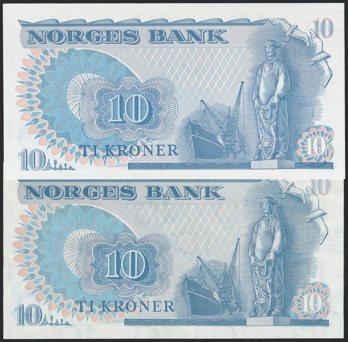 NORWAY. Set of 2 banknotes: 10 Kroner. 1975-1984. (Pick: 36b, 36c). Uncirculated.