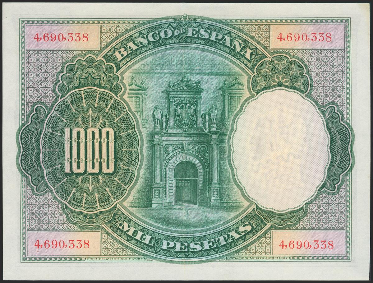 1000 Pesetas. 1 de Julio de 1925. Sin serie y numeración posterior a 3646000. (Edifil 2021: 351). Conserva parte del apresto original. EBC.