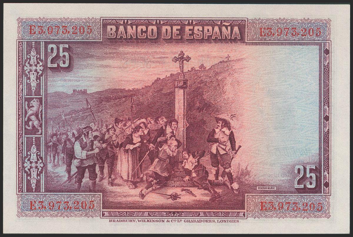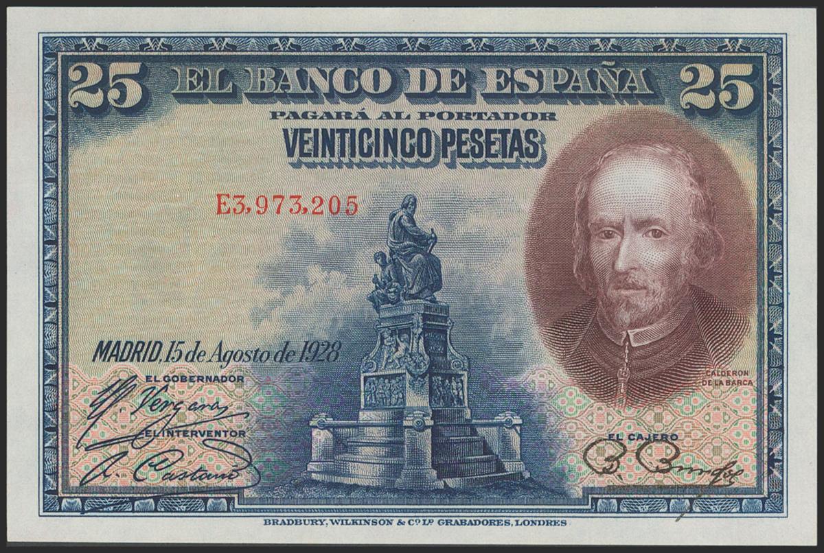 25 Pesetas. 15 de Agosto de 1928. Serie E. (Edifil 2017: 353). Conserva todo su apresto original. SC.