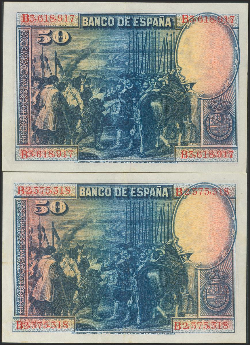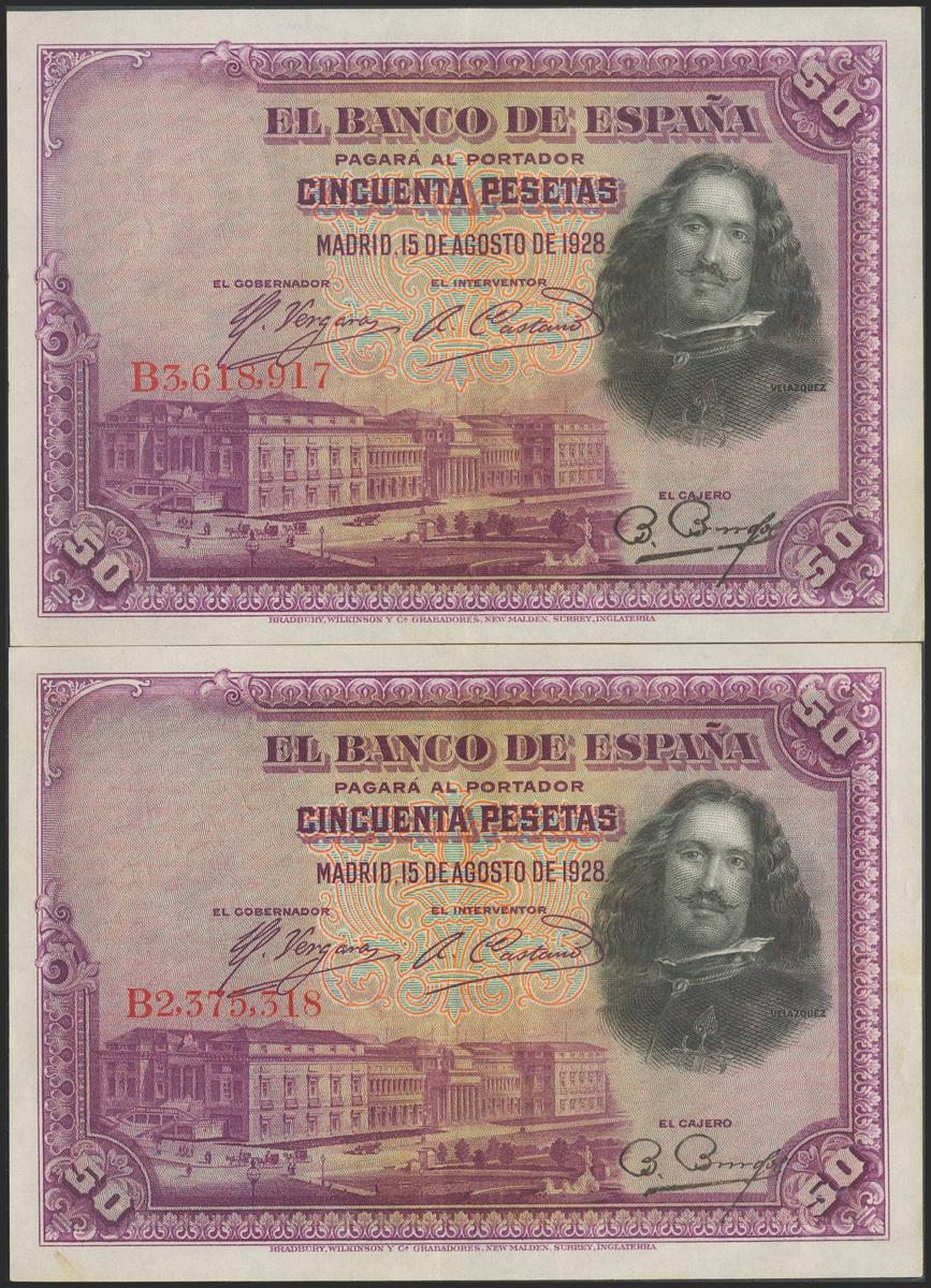 50 Pesetas. 15 de Agosto de 1928. Pareja correlativa. Serie B. (Edifil 2017: 354). Conserva gran parte del apresto original. EBC.