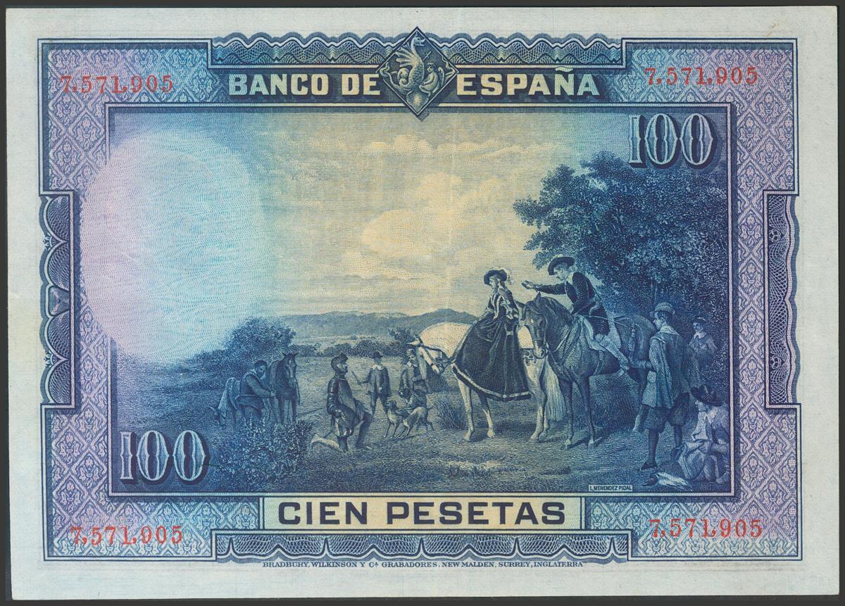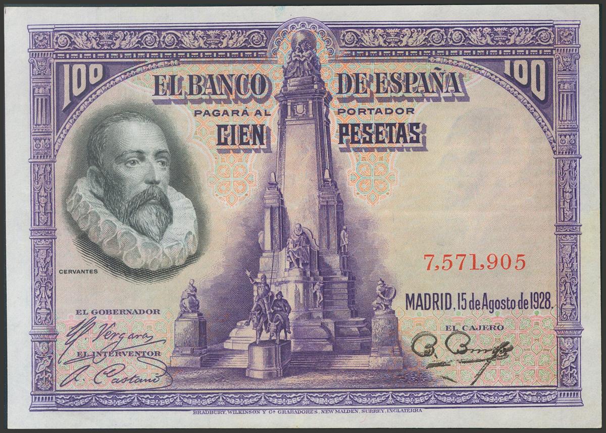 100 Pesetas. 15 de Agosto de 1928. Sin serie. (Edifil 2017: 355). Conserva parte del apresto original. EBC.