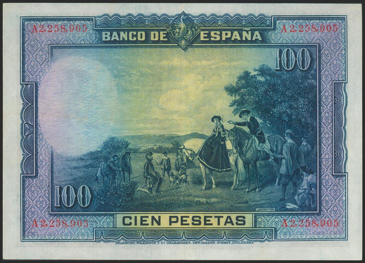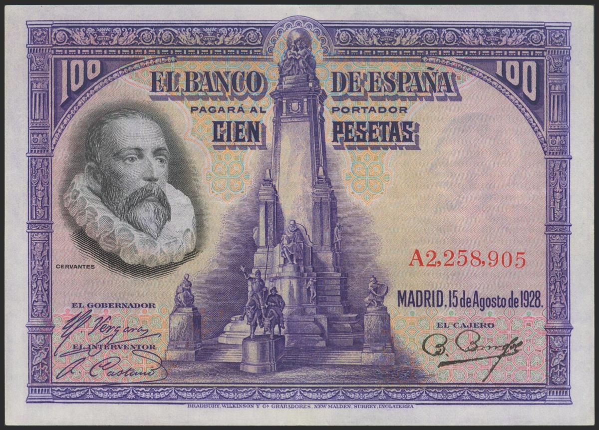100 Pesetas. 15 de Agosto de 1928. Serie A. (Edifil 2017: 355a). Conserva parte del apresto original. EBC+.
