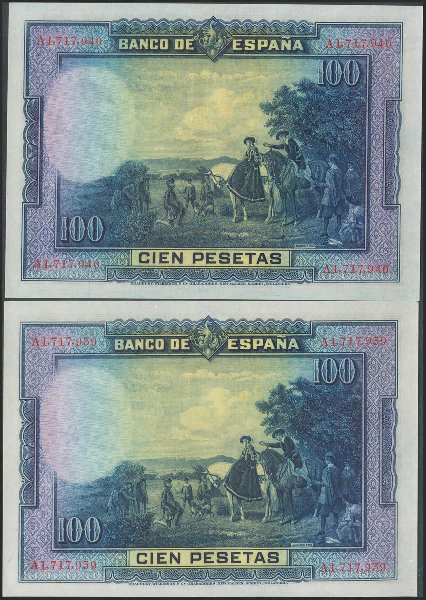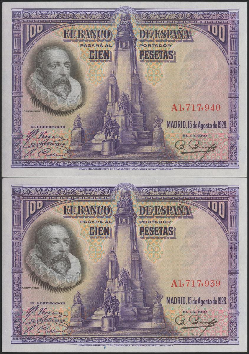 100 Pesetas. 15 de Agosto de 1928. Pareja correlativa. Serie A. (Edifil 2017: 355a). Conserva todo su apresto original, muy atractiva pareja. SC.
