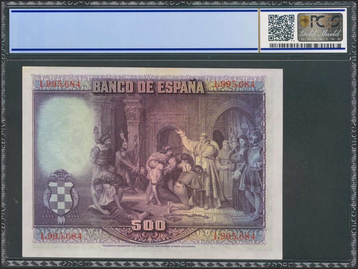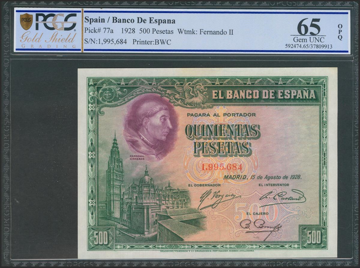 500 Pesetas. 15 de Agosto de 1928. Sin serie. (Edifil 2021: 356). Apresto original. SC. Encapsulado PCGS65OPQ.