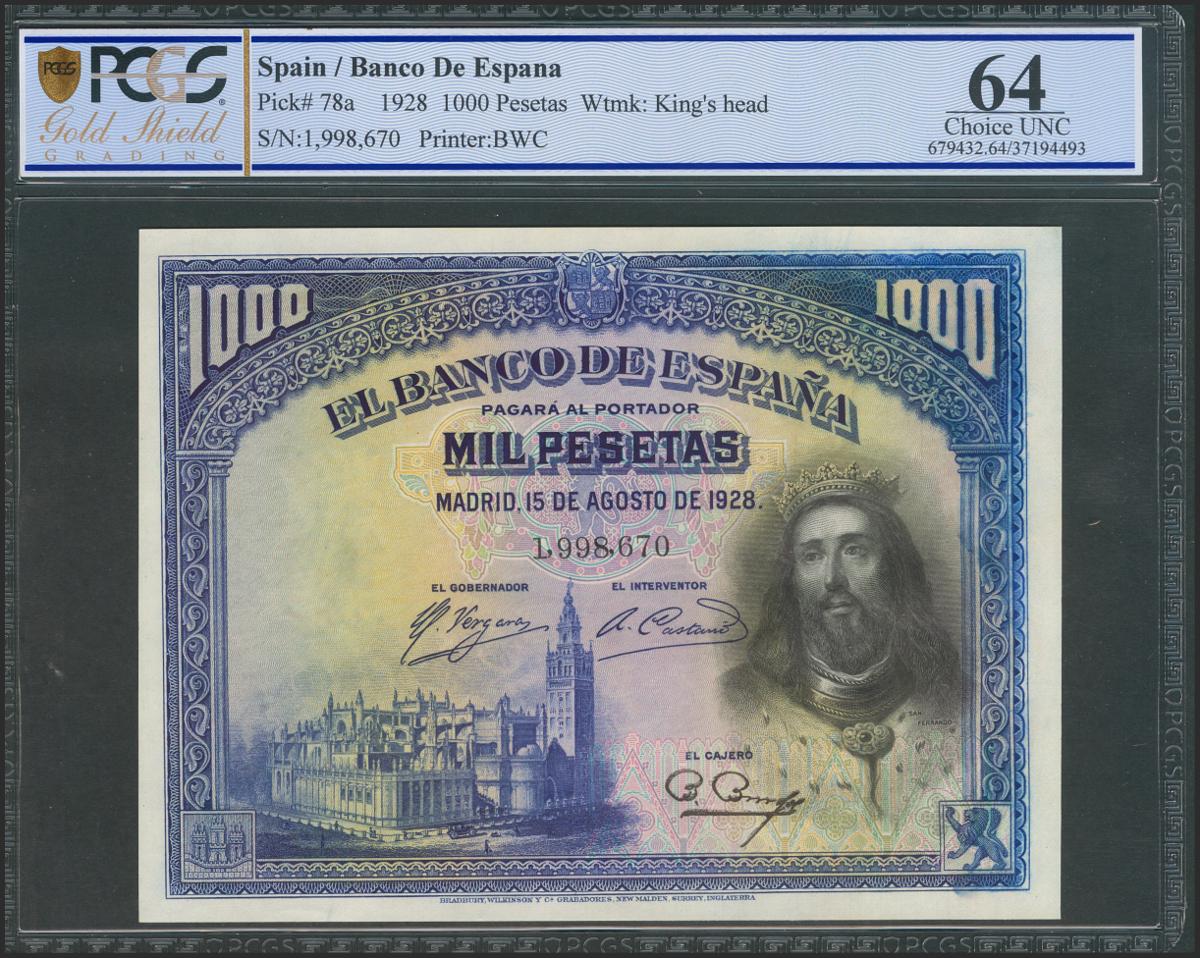 1000 Pesetas. 15 de Agosto de 1928. (Edifil 2021: 357). SC. Encapsulado PCGS64.