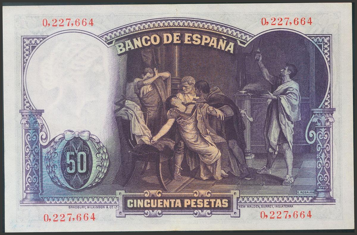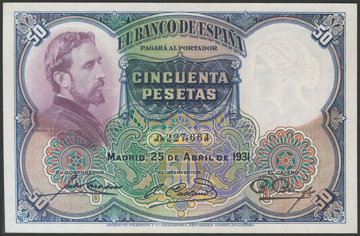 50 Pesetas. 25 de Abril de 1931. Sin serie y numeración baja. (Edifil 2017: 359). Presenta todo su apresto original, muy atractivo. EBC+.