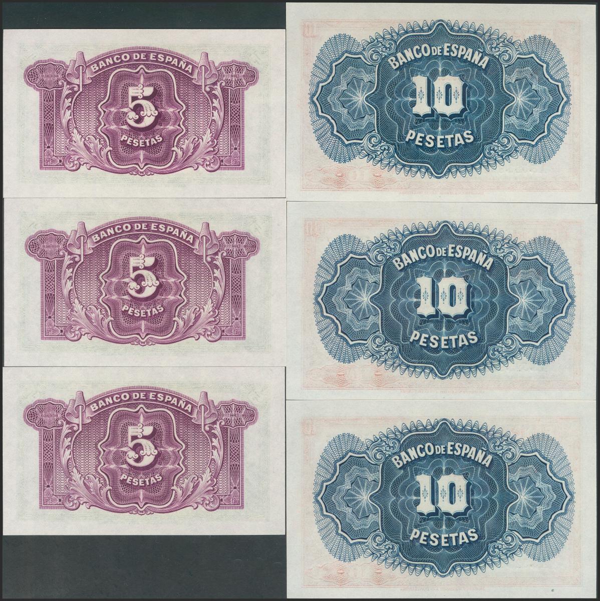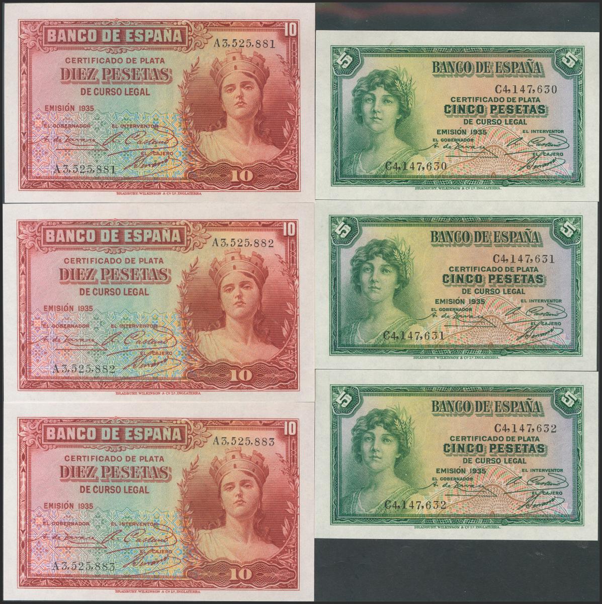 5 Pesetas y 10 Pesetas. 1935. Trío correlativo. Series C y A, respectivamente. (Edifil 2017: 363/64a). Apresto original. SC/SC-.