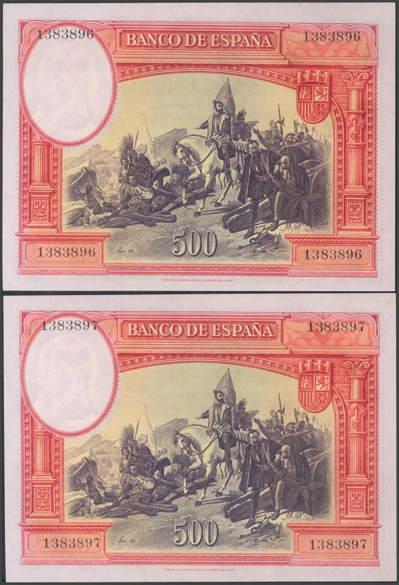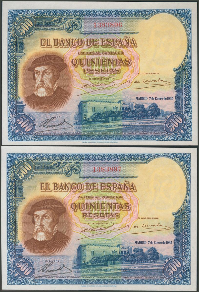 500 Pesetas. 7 de Enero de 1935. Pareja correlativa. Sin serie. (Edifil 2017: 365). Apresto original. SC.