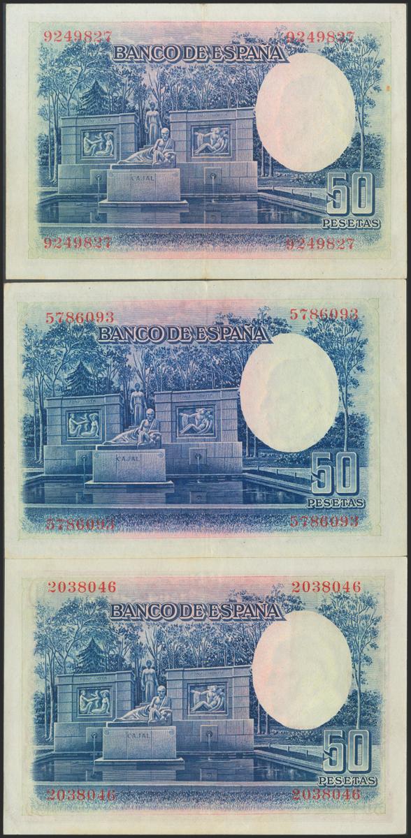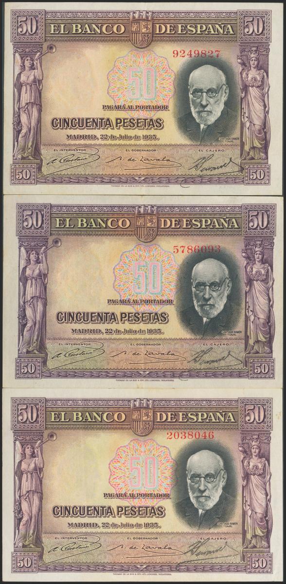 Conjunto de 3 billetes de 50 Pesetas, emitidos el 22 de Julio de 1935, todos ellos sin serie. (Edifil 2021: 366), presentan gran parte de su apresto original. EBC.