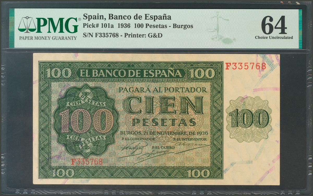 100 Pesetas. 21 de Noviembre de 1936. Serie F. (Edifil 2017: 421a). SC. Encapsulado PMG64.