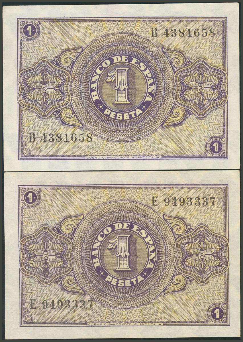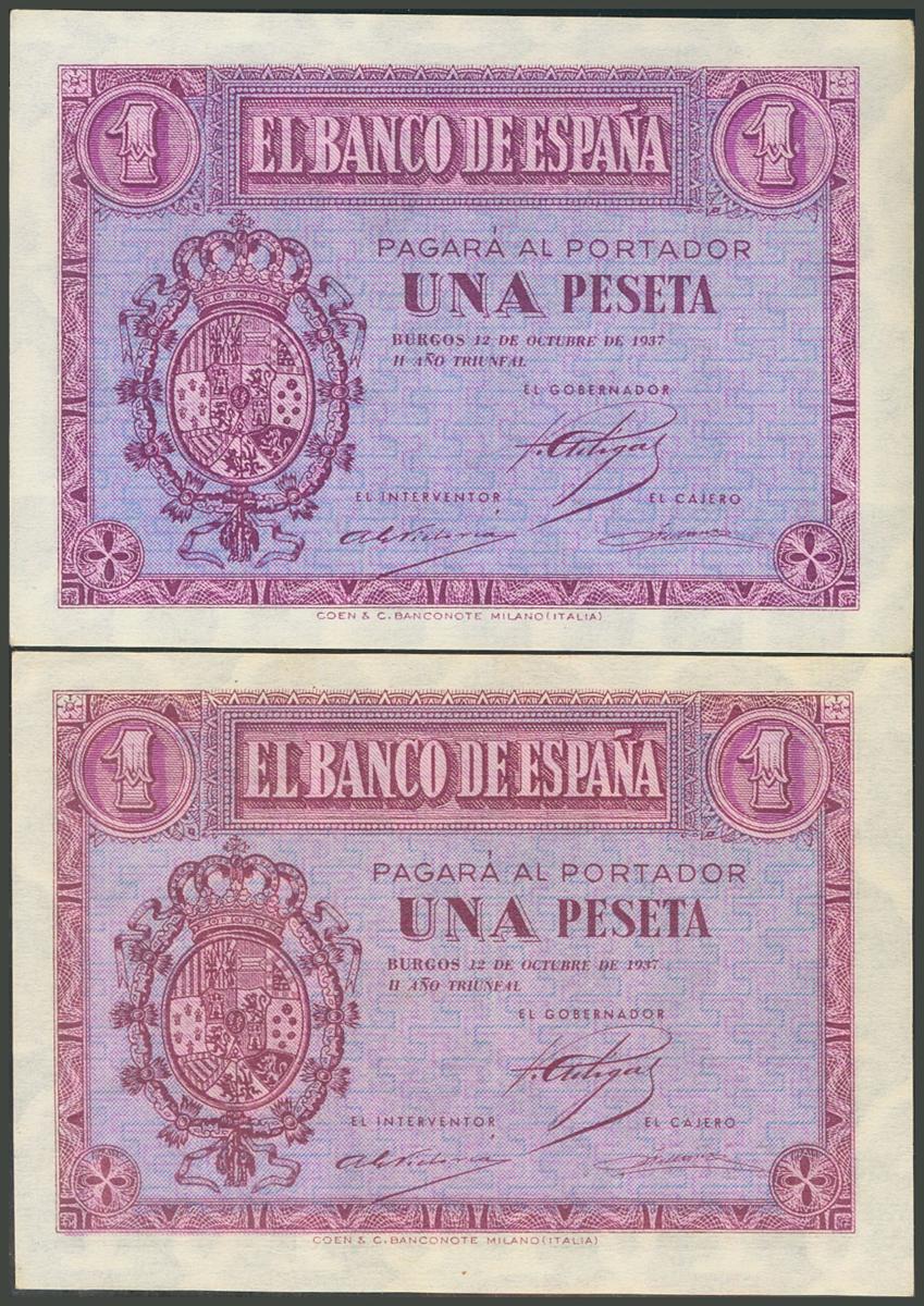 Conjunto de 2 billetes de 1 Peseta emitidos el 12 de Octubre de 1937 con la serie B y E, respectivamente. (Edifil 2017: 425a). Apresto orginal. SC-.