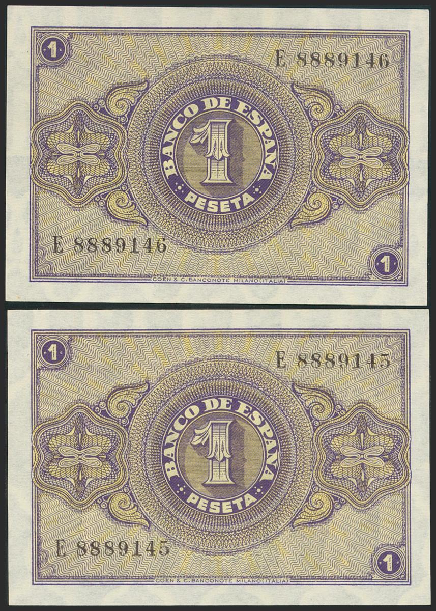 1 Peseta. 28 de Febrero de 1938. Pareja correlativa. Serie E. (Edifil 2021: 427a). Apresto original. SC.