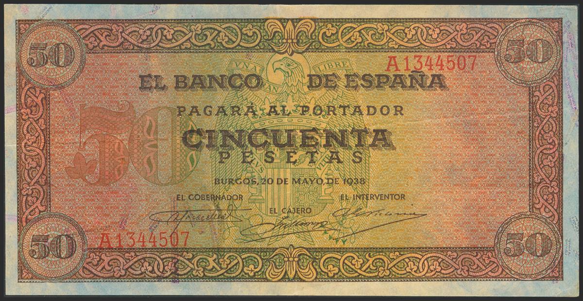 50 Pesetas. 20 de Mayo de 1938. Serie A. (Edifil 2021: 431). MBC.