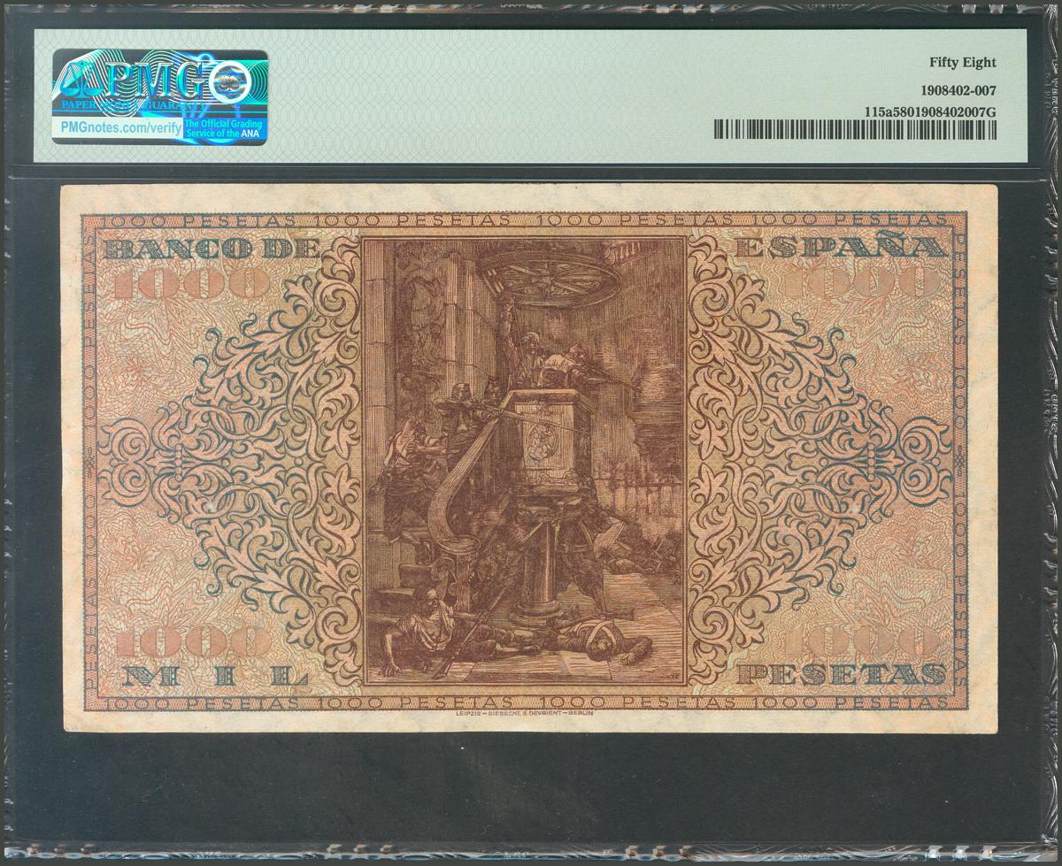 1000 Pesetas. 20 de Mayo de 1938. Serie A. (Edifil 2017: 434). Raro en esta calidad. EBC+. Encapsulado PMG58.