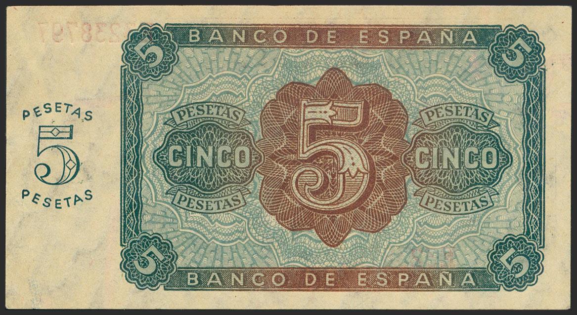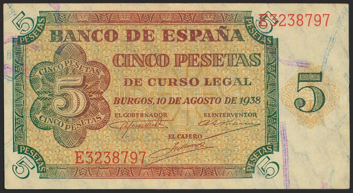 5 Pesetas. 10 de Agosto de 1938. Serie E. (Edifil 2021: 435a). Apresto original. SC.
