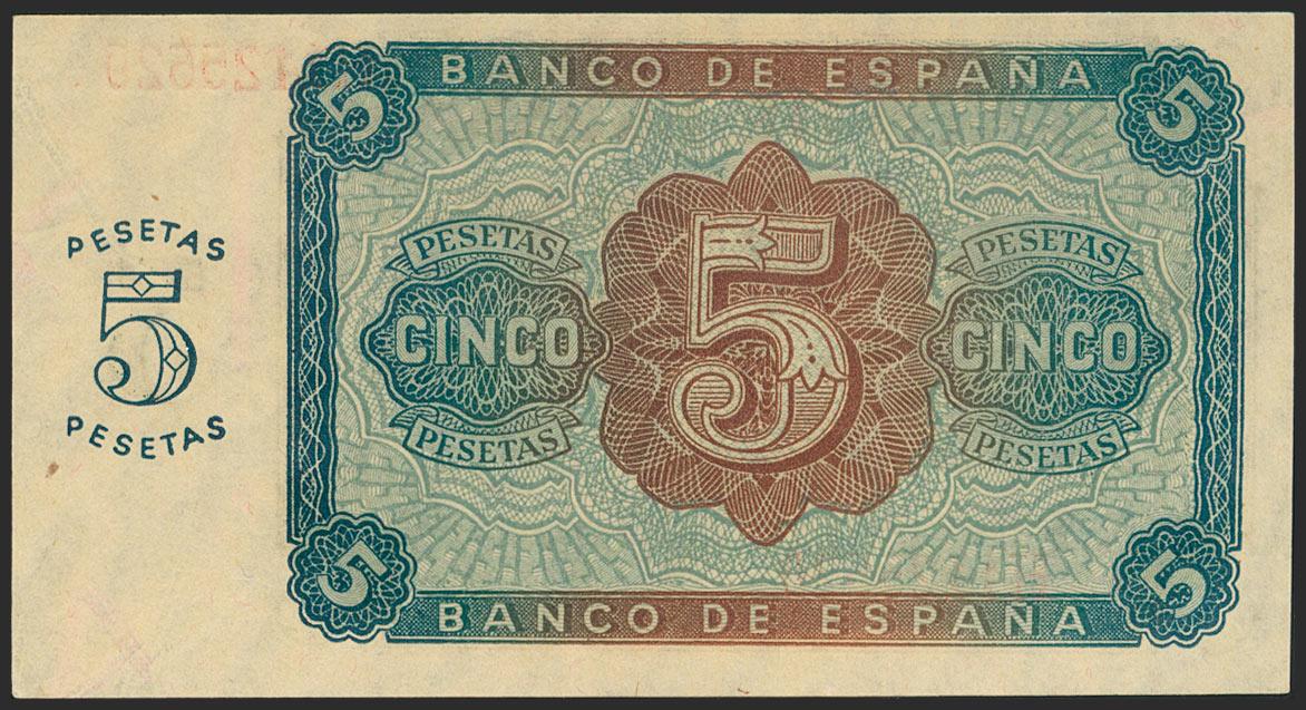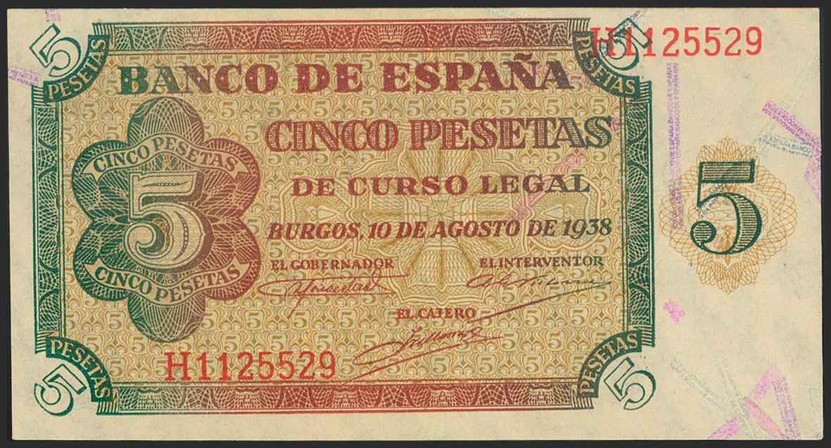 5 Pesetas. 10 de Agosto de 1938. Serie H. (Edifil 2021: 435a). Apresto original. SC.