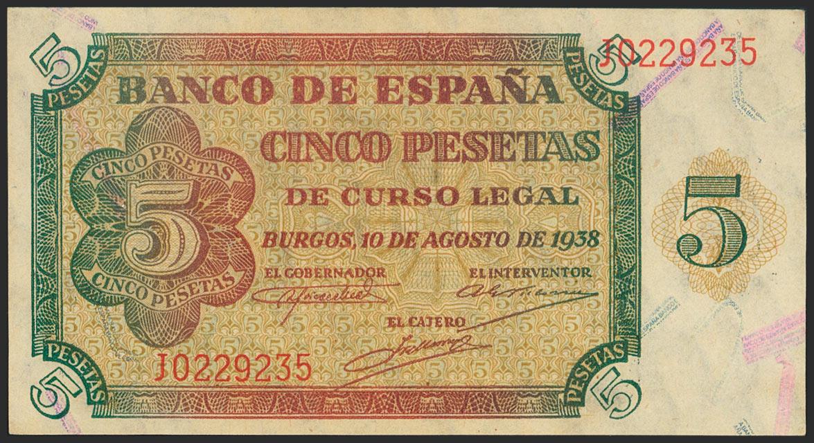 5 Pesetas. 10 de Agosto de 1938. Serie J. (Edifil 2021: 435a). Apresto original. SC.
