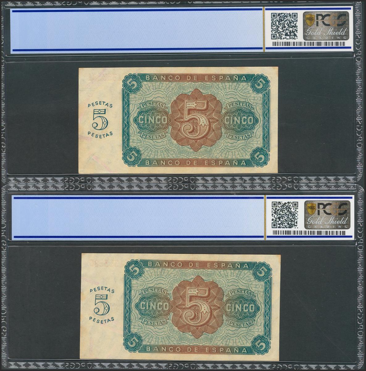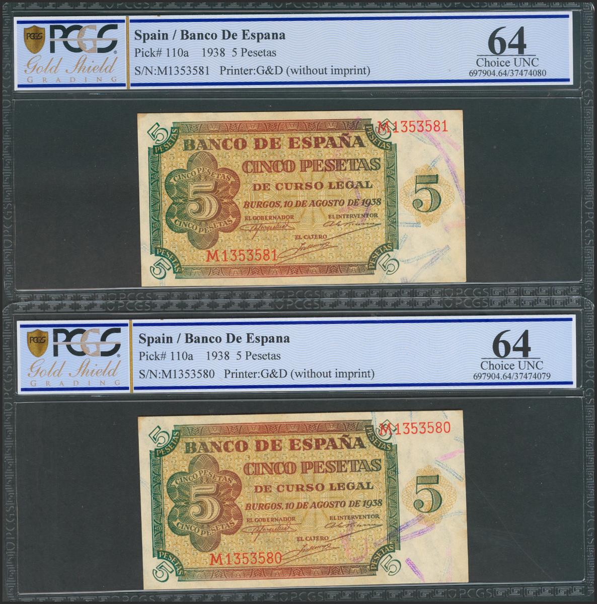 5 Pesetas. 10 de Agosto de 1938. Pareja correlativa. Serie M, última serie emitida. (Edifil 2021: 435b). Rarísimos con la última serie. Encapsulados PCGS64, ambos.
