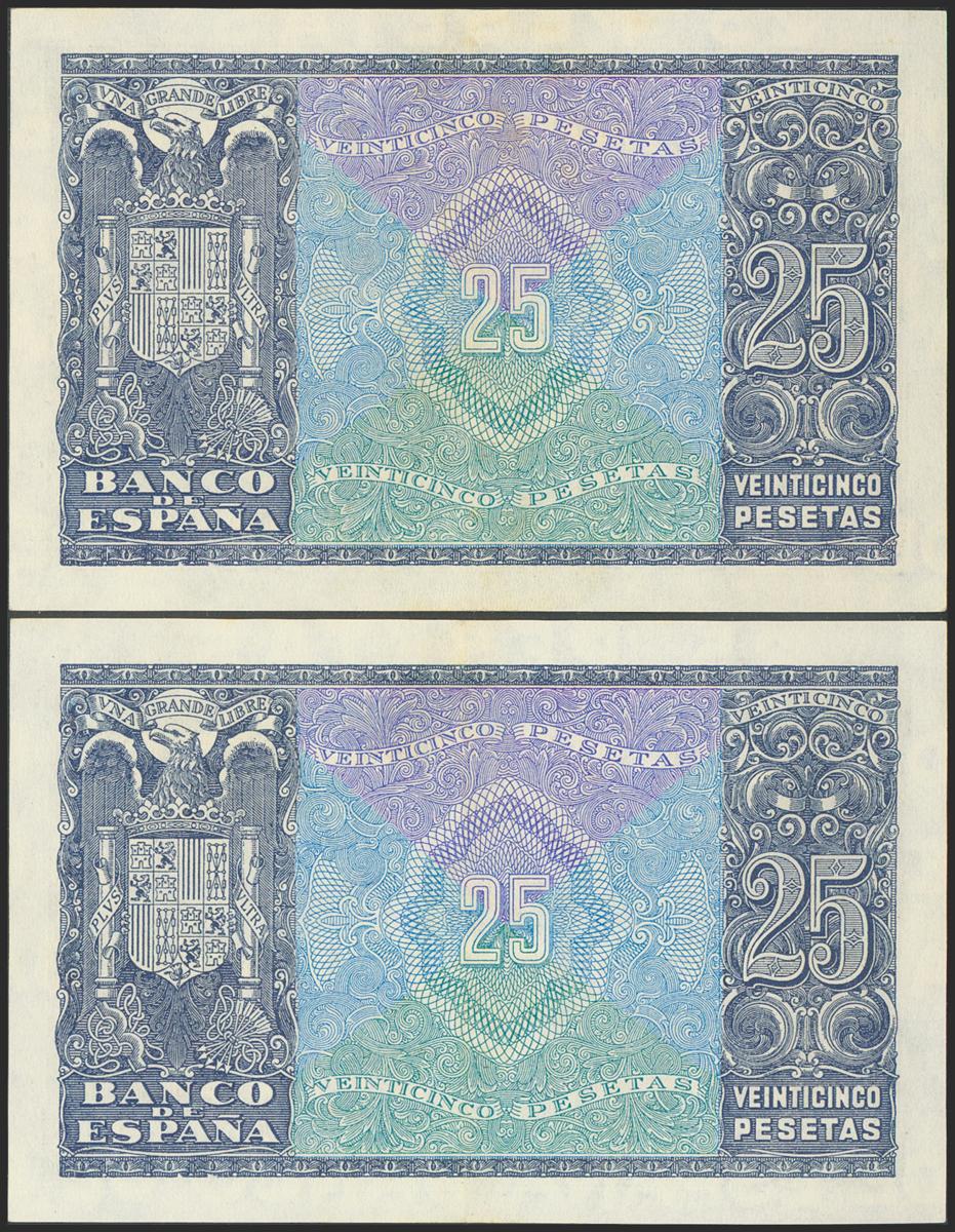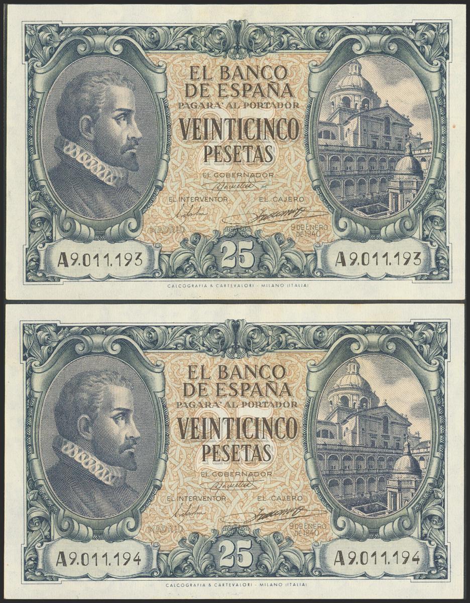 25 Pesetas. 9 de Enero de 1940. Pareja correlativa. Serie A. (Edifil 2021: 436). Conserva la mayor parte de su apresto original. EBC+.